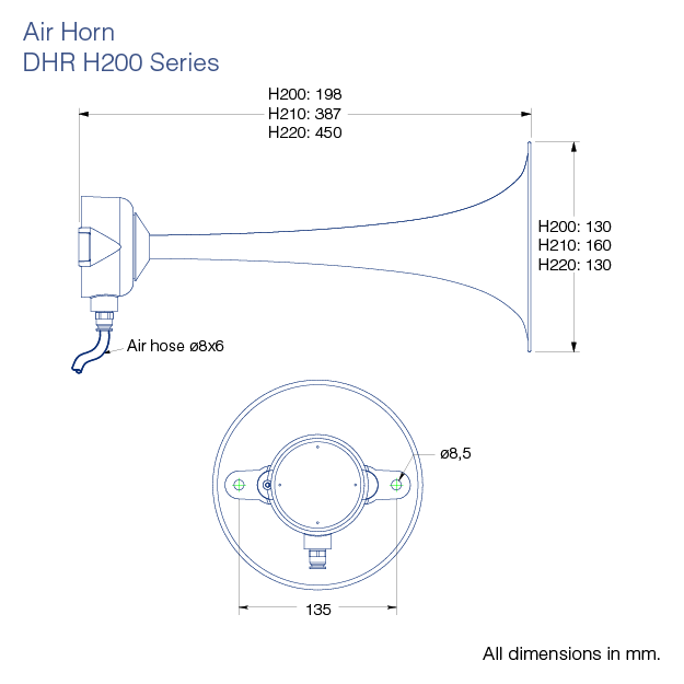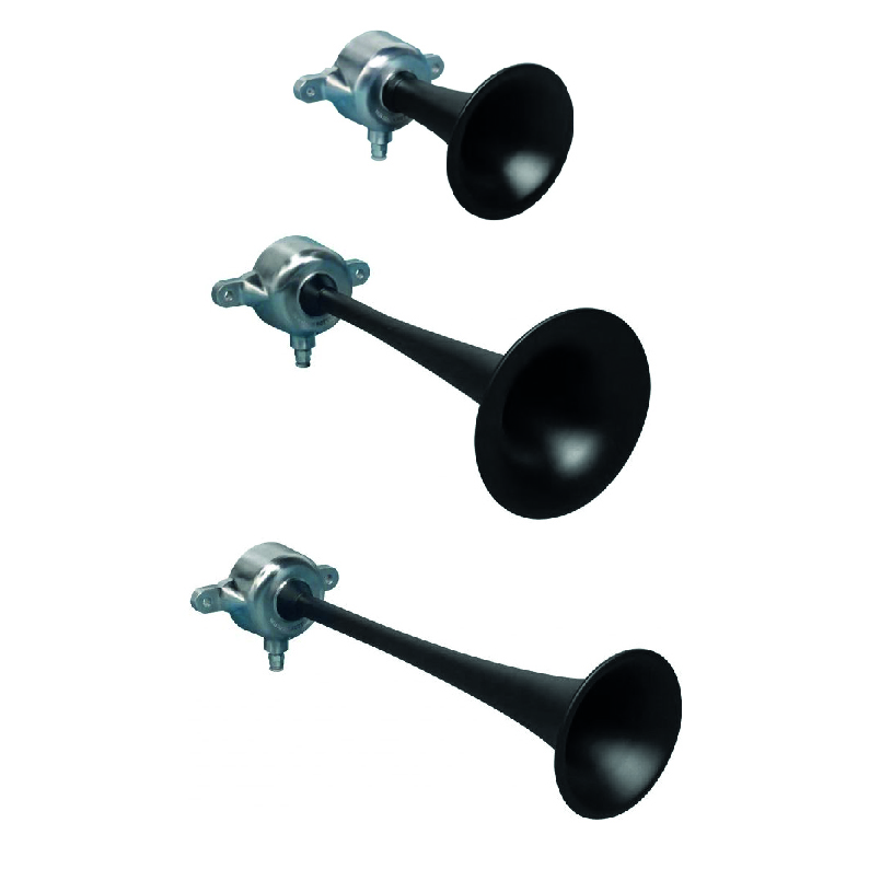 HornLengthDiameterWeightFundamental frequencySound pressure levelArticle codeH200198 mm130 mm1.2 Kg660 Hz116 - 138 dB(A)20001H210387 mm160 mm1.4 Kg377 Hz116 - 132 dB(A)20002H220450 mm130 mm1.4 Kg307 Hz116 - 132 dB(A)20003