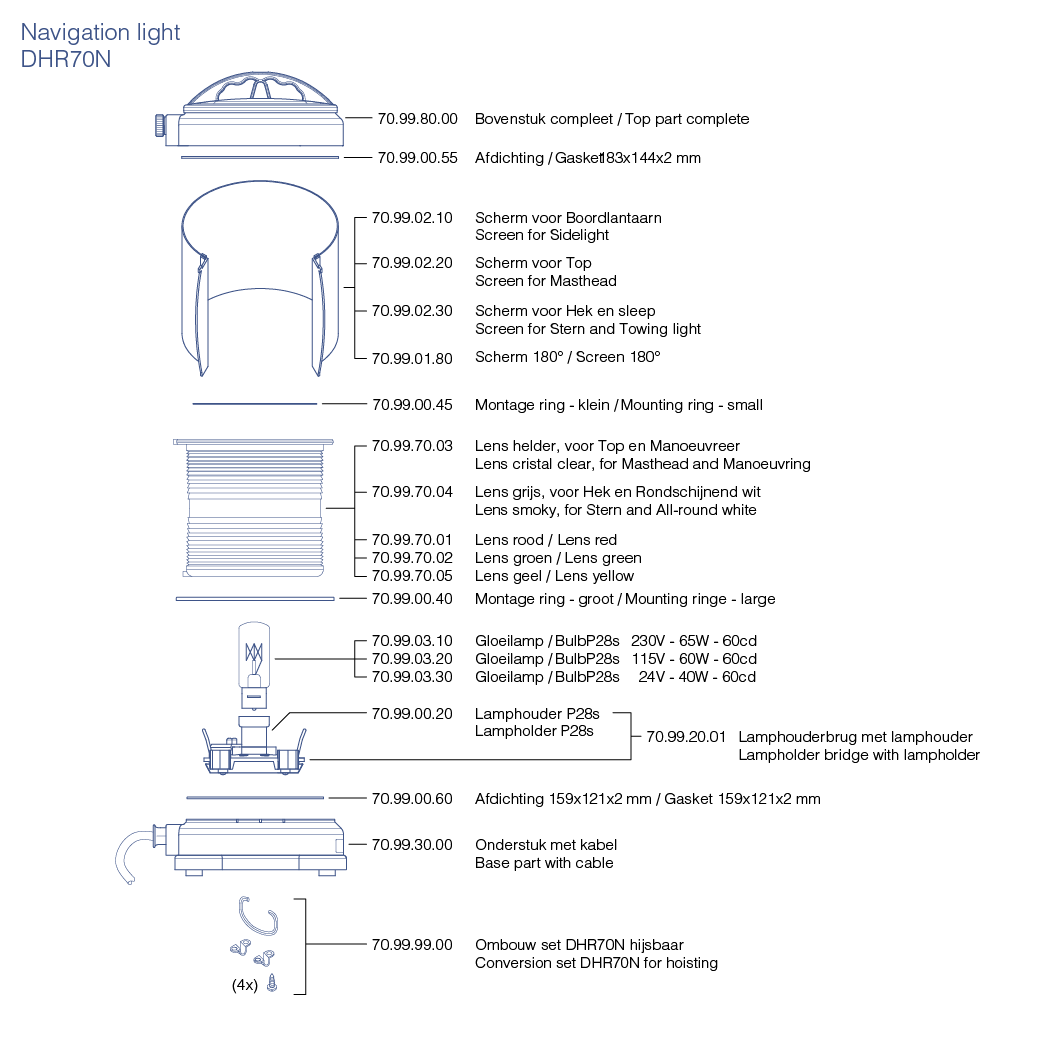 SectorMin. visibilityLampholderApprovalArticle codesStarboard3 N.M.P28sCOLREG’72 – RPR/BPR70.11.00.00Port3 N.M.P28sCOLREG’72 – RPR/BPR70.12.00.00Masthead6 N.M.P28sCOLREG’7270.13.00.00Stern3 N.M.P28sCOLREG’72 – RPR/BPR70.14.00.00Stern Red3 N.M.P28sSuez Canal70.14.17.00Towing3 N.M.P28sCOLREG’7270.15.00.00 Article codesAll-round lightsMin. visibilityLampholderApprovalAll-round180° ScreenedAll-round white3 N.M.P28sCOLREG’72 – RPR/BPR70.16.00.0070.16.01.80All-round manoeuvring5 N.M.P28sCOLREG’7270.16.10.00-All-round red3 N.M.P28sCOLREG’72 – RPR/BPR70.17.00.0070.17.01.80All-round green3 N.M.P28sCOLREG’72 – RPR/BPR70.18.00.0070.18.01.80All-round yellow3 N.M.P28sCOLREG’7270.19.00.0070.19.01.80