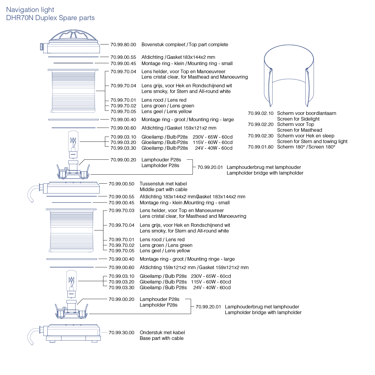 Available models DHR70N DuplexSectorMin. visibilityLampholderApprovalArticle codesStarboard3 N.M.P28sCOLREG’72 – RPR/BPR70.21.00.00Port3 N.M.P28sCOLREG’72 – RPR/BPR70.22.00.00Masthead6 N.M.P28sCOLREG’7270.23.00.00Stern3 N.M.P28sCOLREG’72 – RPR/BPR70.24.00.00Towing3 N.M.P28sCOLREG’7270.25.00.00     All-round lights    Article codesSectorMin. visibilityLampholderApprovalAll-round180° ScreenedAll-round white3 N.M.P28sCOLREG’72 – RPR/BPR70.26.00.0070.26.01.80All-round red3 N.M.P28sCOLREG’72 – RPR/BPR70.27.00.0070.27.01.80All-round green3 N.M.P28sCOLREG’72 – RPR/BPR70.28.00.0070.28.01.80All-round yellow3 N.M.P28sCOLREG’7270.29.00.0070.29.01.80All-round red over green3 N.M.P28sCOLREG’72 – RPR/BPR70.17.18.00-All-round green over red3 N.M.P28sCOLREG’72 – RPR/BPR70.18.17.00-All-round white over red3 N.M.P28sCOLREG’72 – RPR/BPR70.16.17.00-All-round red over white3 N.M.P28sCOLREG’72 – RPR/BPR70.17.16.00-